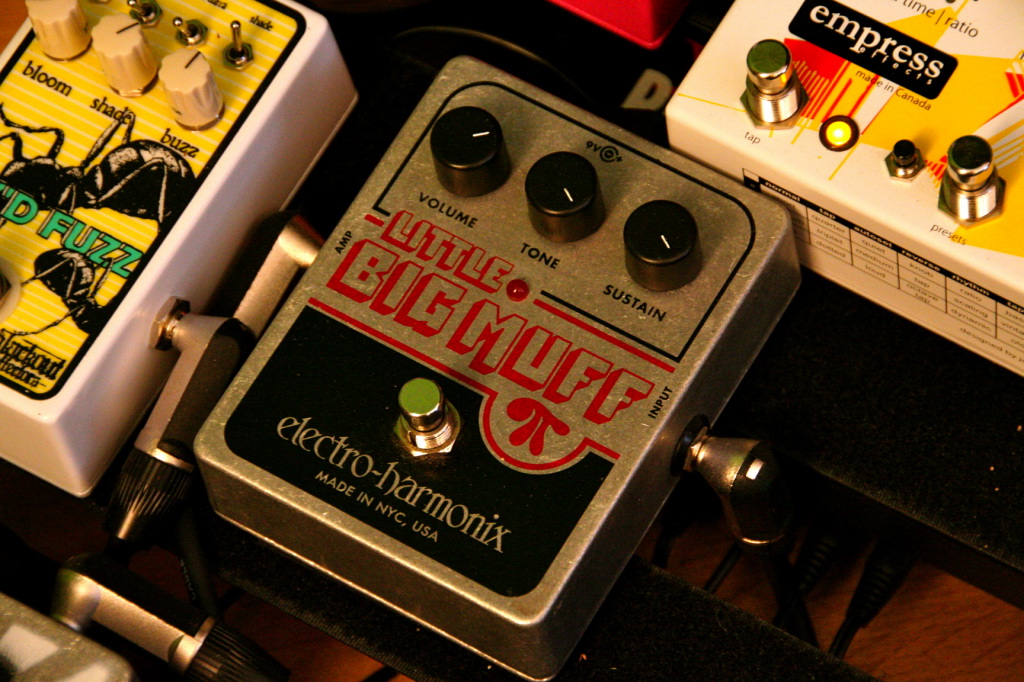 Inspirée par le son d’Hendrix et finalement popularisée après sa mort dès 1971 par des mythes comme Gilmour et Santana puis plus tard les Cobain, Sonic Youth et autre Jack White (pour ne citer qu’eux…), la légendaire pédale de Fuzz Big Muff a été miniaturisée par Electro Harmonix pour donner la présente Little Big Muff.