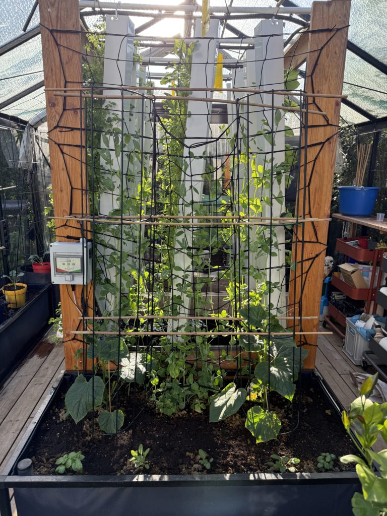 Les trois premiers plants de concombres snack ayant été planté tôt dans l’année (à la mi-avril), j’en ai relancé trois pour finir la saison (semis à la mi-juin, planté vers mi-juillet)