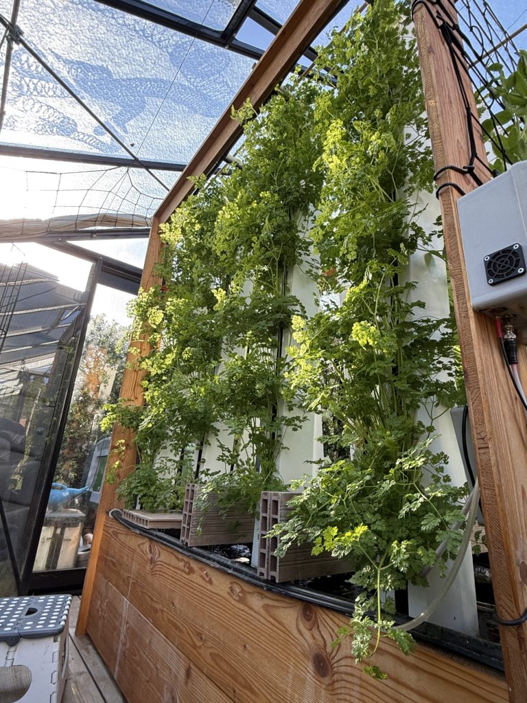 Dans les tours verticales du système aquaponique de la serre connectée, nous avions mis l’accent sur les cultures rapides à forte rotation, comme les salades, le cresson, le cerfeuil, les choux raves et des aromatiques (basilique, aneth, …). Le but était de rentabiliser l’espace et ça a plutôt bien fonctionné.