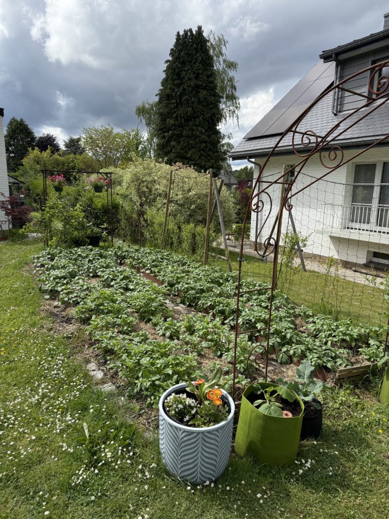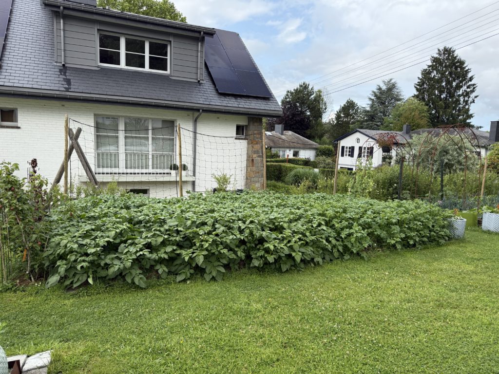 Début de saison, nous consacrons deux planches de cultures aux pommes de terre, accompagnées de petit pois et haricots à rames… qui ne sont jamais montés 😒