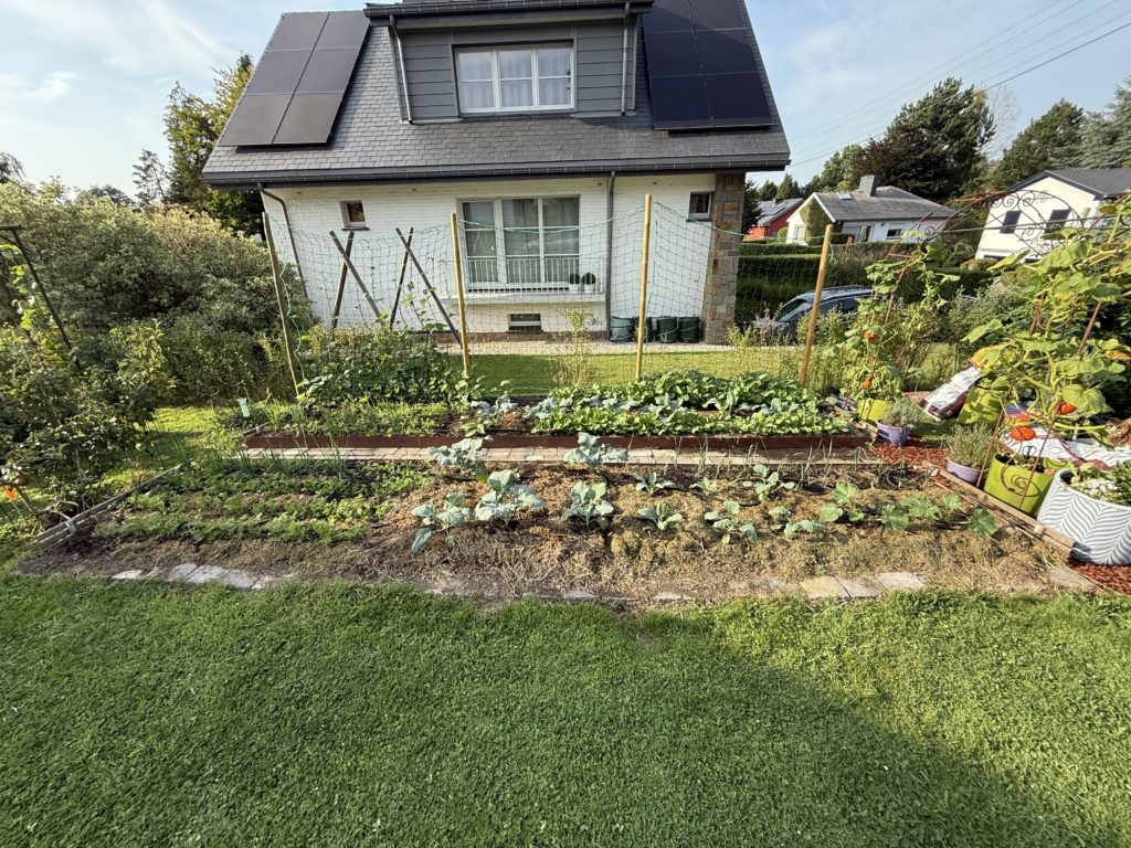 Il faut prendre en considération que les zones de cultures ont été légèrement agrandies avec désormais 2x 1.5 mètres carrés en growbed et la planche en « zone magnolia » de 4 mètres carrés. À cela se rajoutent plusieurs pots géotextiles sur la terrasse et la zone dédiée aux fraises, ce qui nous amène environ à 40 mètres carrés cultivés (pour 30 l’année dernière).